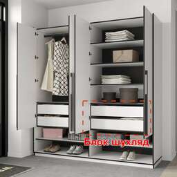 Завдяки якісним матеріалам, шафа стійка до зношування та довговічна, а сучасні механізми відкривання забезпечують зручність у користуванні. Лаконічні фасади, можливість вибору кольору та текстури дозволяють легко інтегрувати її в будь-який інтер'єр – від класики до мінімалізму. Така шафа стане не лише практичним, а й стильним акцентом у вашому просторі.Внутрішнє наповнення шафи - штанга і полиці. Знизу - відкриті полиці.