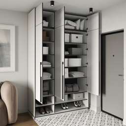 Завдяки якісним матеріалам, шафа стійка до зношування та довговічна, а сучасні механізми відкривання забезпечують зручність у користуванні. Лаконічні фасади, можливість вибору кольору та текстури дозволяють легко інтегрувати її в будь-який інтер'єр – від класики до мінімалізму. Така шафа стане не лише практичним, а й стильним акцентом у вашому просторі.Внутрішнє наповнення шафи - штанга і полиці. Знизу - відкриті полиці. Зверху - антресоль.